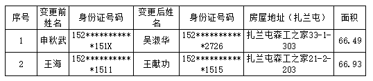 根據(jù)內(nèi)蒙古森工集團棚戶區(qū)改造工程不動產(chǎn)分戶登記工作要求,現(xiàn)將金河森林工業(yè)有限責任公司棚戶區(qū)不動產(chǎn)分戶登記變更名單公示如下,公示期限:2023年11月17日---2023年12月2日。如有異議請聯(lián)系工作人員。